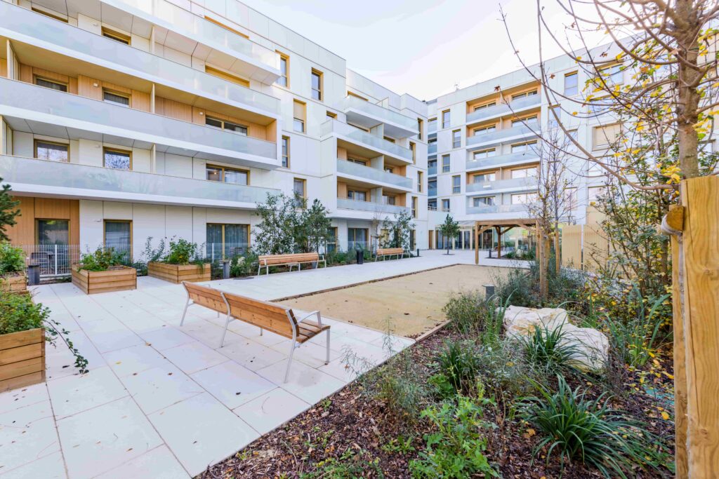 La résidence se trouve au cœur d’un projet de nouveau quartier mêlant les générations et construit avec un objectif bas carbone fort. Les 1 500m2 de toitures végétalisées ainsi que les 800m2 d’espace vert au centre des bâtiments offrent un cadre de vie agréable et verdoyant.