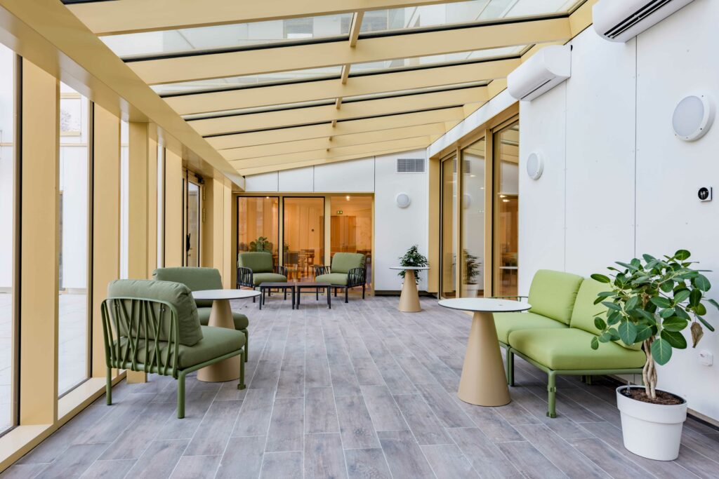 La résidence se trouve au cœur d’un projet de nouveau quartier mêlant les générations et construit avec un objectif bas carbone fort. Les 1 500m2 de toitures végétalisées ainsi que les 800m2 d’espace vert au centre des bâtiments offrent un cadre de vie agréable et verdoyant.
